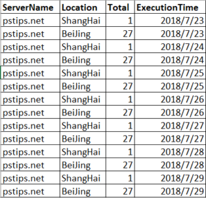 ServerName,Location,Total,ExecutionTime Pstips.NET,ShangHai,1,2018-07-31 Pstips.NET,Beijing,2,2018-08-01 Pstips.NET,ShangHai,3,2018-08-02 Pstips.NET,Beijing,4,2018-08-03 Pstips.NET,ShangHai,5,2018-08-04 Pstips.NET,Beijing,6,2018-08-05 Pstips.NET,ShangHai,7,2018-08-06 Pstips.NET,Beijing,8,2018-08-07