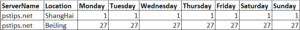 ServerName Location Monday Tuesday Wednesday Thursday Friday Saturday Sunday ---------- -------- ------ ------- --------- -------- ------ -------- ------ Pstips.NET ShangHai 7 1 0 3 0 5 0 Pstips.NET Beijing 0 8 2 0 4 0 6
