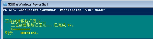 PS C:\> Checkpoint-Computer -Description "win7 test" PS C:\> Get-ComputerRestorePoint CreationTime Description SequenceNumber EventType Res ------------ ----------- -------------- --------- --- 2013/9/20 10:09:25 win7 test 3 BEGIN_SYSTEM_C... APP PS C:\> $point= Get-ComputerRestorePoint -RestorePoint 3 PS C:\> $point CreationTime Description SequenceNumber EventType RestorePointType ------------ ----------- -------------- --------- ---------------- 2013/9/20 10:09:25 win7 test 3 BEGIN_SYSTEM_C... APPLICATION_INSTALL PS C:\> Restore-Computer -RestorePoint $point.SequenceNumber