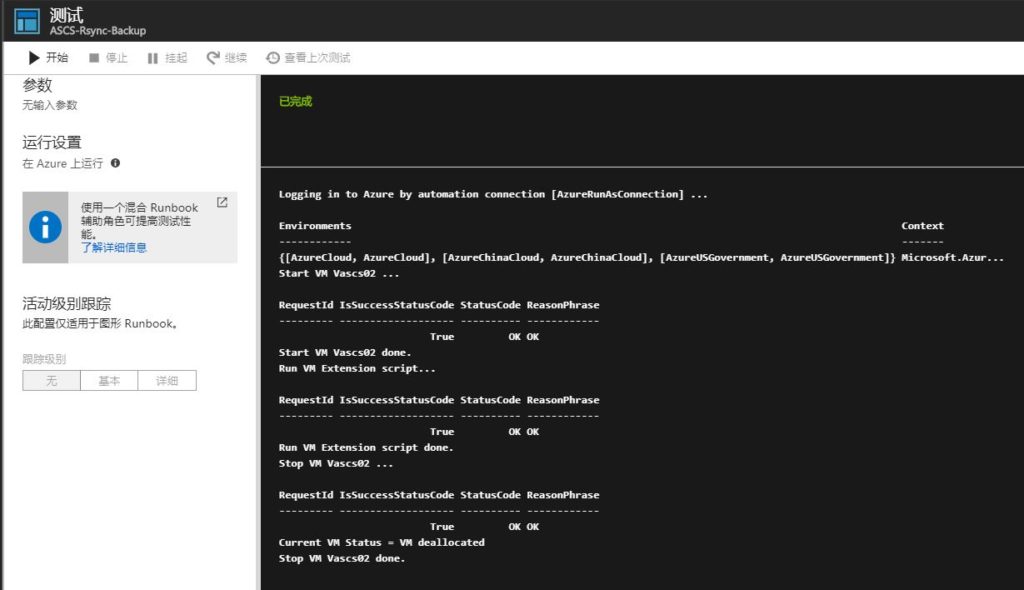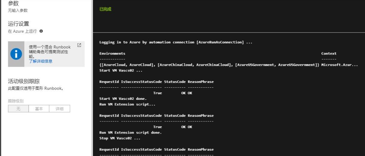 在上文图中展示的脚本编辑框中,点击【测试窗格】,再点击【开始】按钮执行Runbook,下面是执行的截图