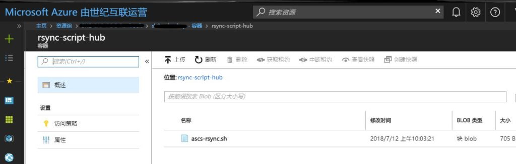 通过Azure的门户创建一个存储账户,添加一个Blob容器,并上传我们的Bash脚本文件。我使用的测试脚本正是《Azure云上SAP-灾备站点部署和配置 》一文中的Bash脚本:/rsync/ascs_sync.sh。