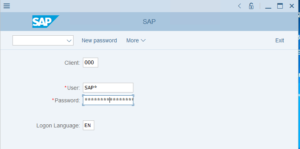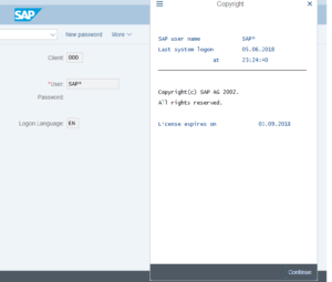 用户名输入SAP*,密码输入应用程序服务器的密码,然后点击菜单中的【More】-> 【User】->【Logon】在接下来的Copyright确认框中点击【Continue】,