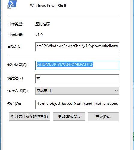 起始位置的值为%HOMEDRIVE%%HOMEPATH%,这个值其实就是家目录环境变量的值,我们可以用PowerShell验证一下: